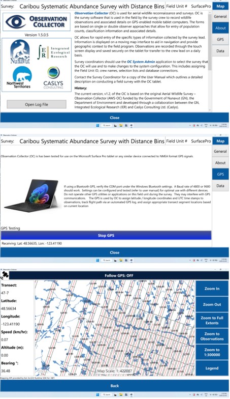 Caslys developed a wildlife field observation application for the Nunavut Department of Environment. The Aerial Wildlife Survey - Observation Collector (OC) software was developed specifically for use in their aerial wildlife survey. The collector was designed for rapid data entry in the field; integrating data forms with GPS and mapping tools on a touchscreen MS Windows tablet. The product has replaced cumbersome and time-consuming paper field forms that were completed during the survey and later entered into a digital format back at the office; and now allows survey results to be viewed in the field, in real-time.